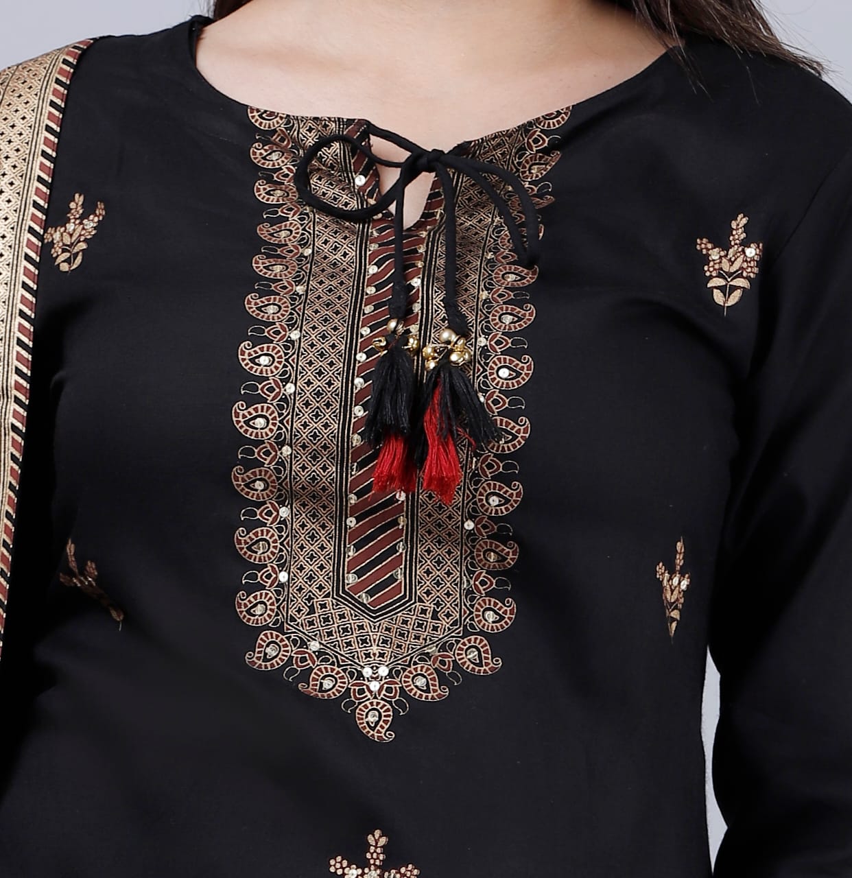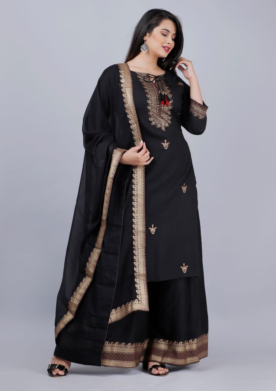 This sophisticated black rayon kurti and plazzo set delivers refined elegance with exceptional comfort. The lightweight, breathable rayon fabric drapes beautifully, while the coordinating plazzo pants offer graceful movement. Complemented by a premium cotton dupatta that adds textural contrast and versatility, this ensemble presents a meticulously crafted option for both everyday wear and special occasions.