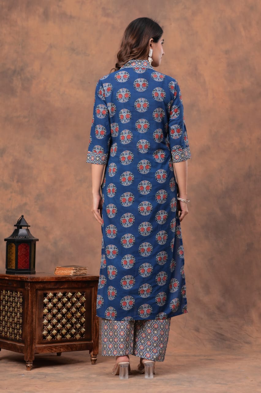 Enhance your wardrobe with our Blue Ajrakh Elegance Kurta Pant With Dupatta Set. Featuring a beautiful blue Ajrakh print, this set exudes elegance. Made from high-quality fabric, it offers both style and comfort. Perfect for any occasion, this set is a must-have for any fashion-forward individual.