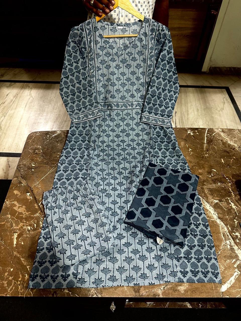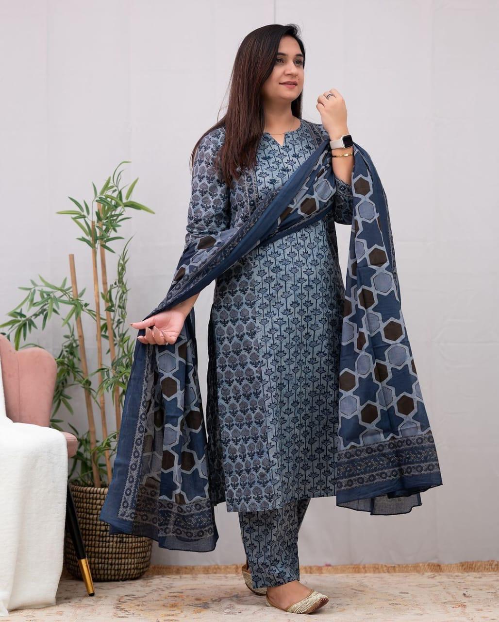 Get the chic look with our Gray Ajrakh Cotton Kurta Pant and Dupatta Set. This set is perfect for any occasion with its elegant design and comfortable fabric. Made from high-quality cotton, it ensures breathability and durability. Add this versatile set to your wardrobe today!