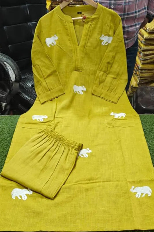 This Majestic Elephant Print Green Kurta Set is a stunning addition to your wardrobe. Made with high-quality materials and featuring a beautiful elephant print design, this kurta set is both stylish and comfortable. With its vibrant green color, it is perfect for any occasion. Elevate your style with this truly majestic kurta set.