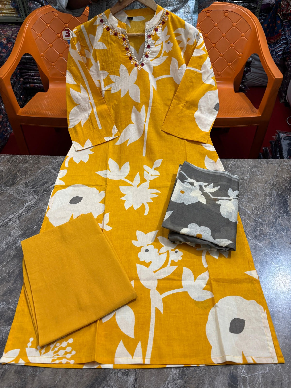 Elevate your ethnic wardrobe with this sophisticated Mustard Floral Kurta & Pant Set with Dupatta. The vibrant mustard base adorned with intricate floral patterns creates a perfect balance between traditional aesthetics and contemporary design. Crafted from premium fabric, this three-piece ensemble ensures comfort while maintaining an elegant silhouette, making it an ideal choice for festive occasions, family gatherings, or cultural celebrations.
