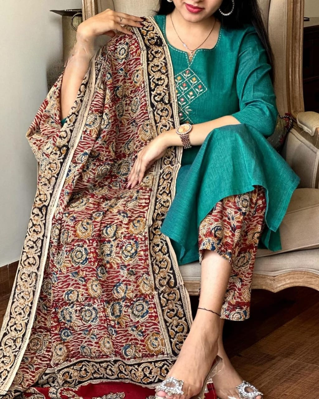This Premium Teal Handcrafted Cotton Kurta Set is made with love and care, ensuring the highest quality. Made from premium cotton material, this kurta set offers comfort and style. The handcrafted design adds a unique touch, making it a must-have addition to your wardrobe.