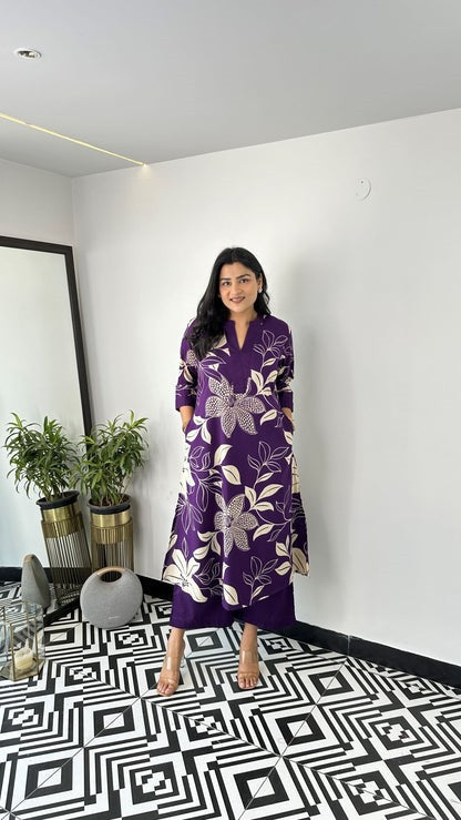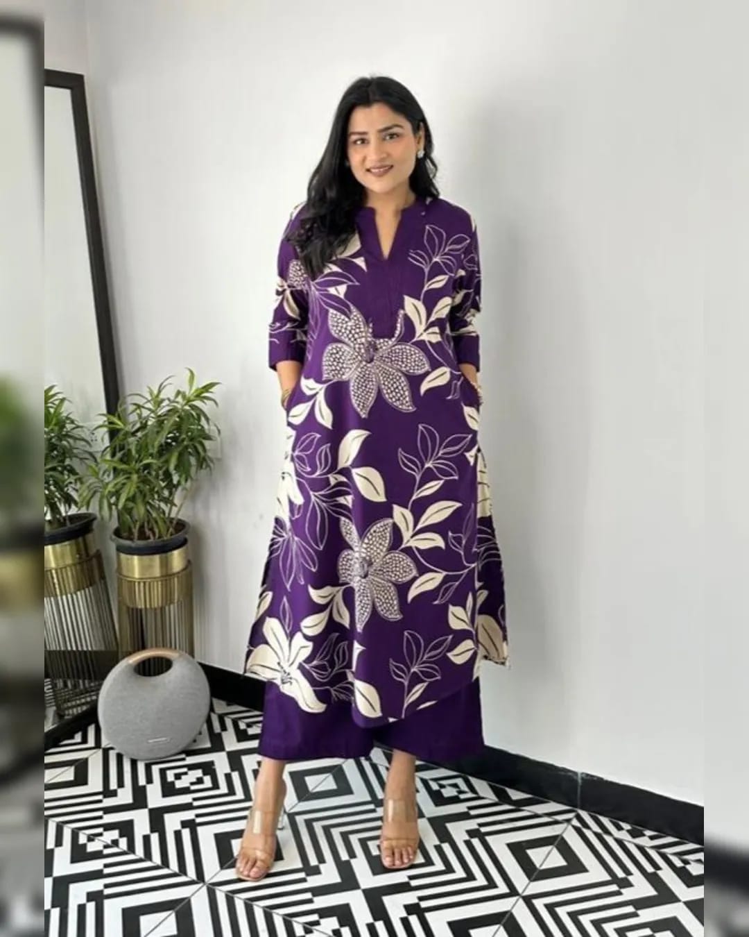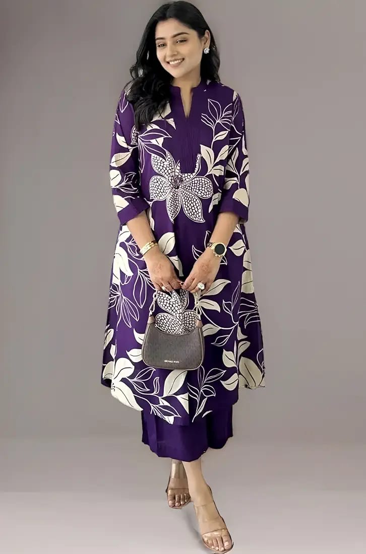 This purple A-line kurta, crafted from a comfortable cotton-viscose blend, offers breathable wear with a soft texture ideal for daily use. Featuring an elegant printed design, it pairs seamlessly with matching pants to create a coordinated, stylish outfit. The fabric’s natural fibers ensure durability and ease of maintenance, making it a practical yet fashionable choice for women seeking both comfort and sophistication.