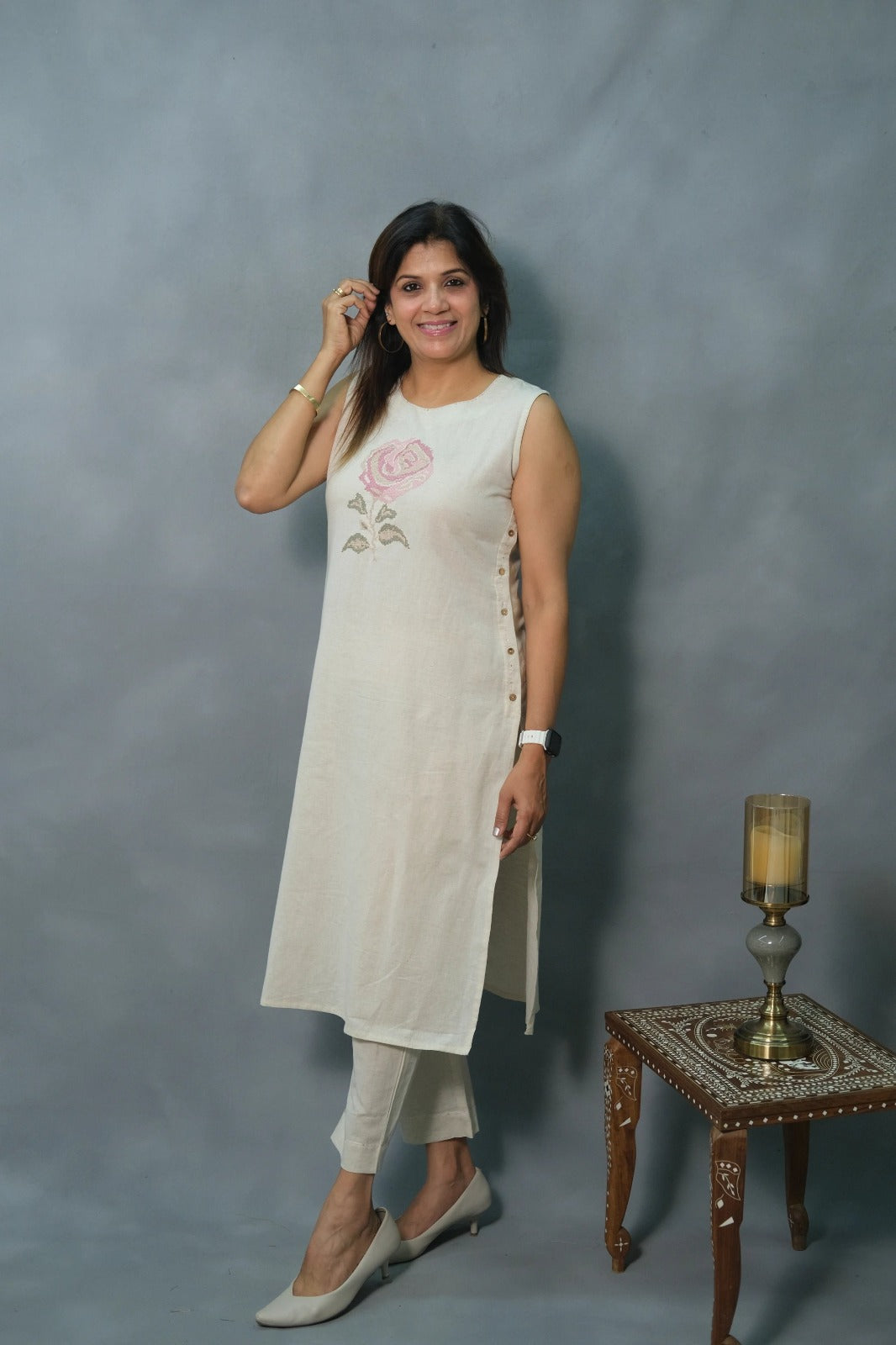 The White Flex Cotton Co-ord Set combines comfort and style with its breathable, imported cotton fabric. Featuring a soft kurta and matching pants adorned with a subtle brush print, this set is ideal for professional settings and casual outings alike. Its lightweight material ensures all-day comfort, making it a versatile choice for workwear and relaxed occasions.