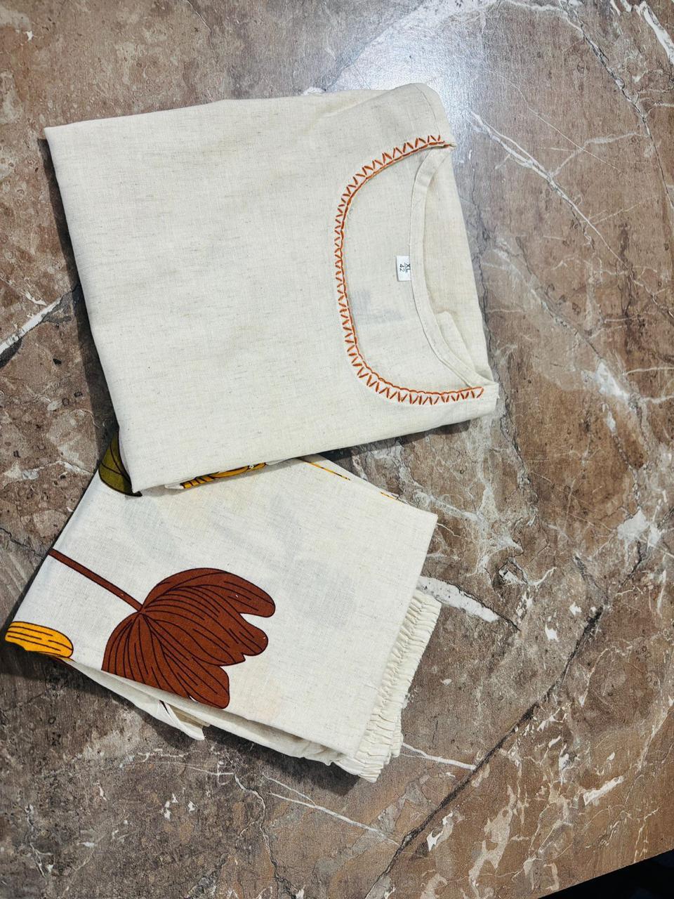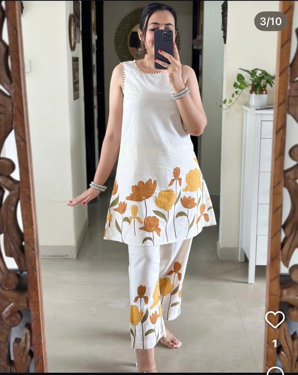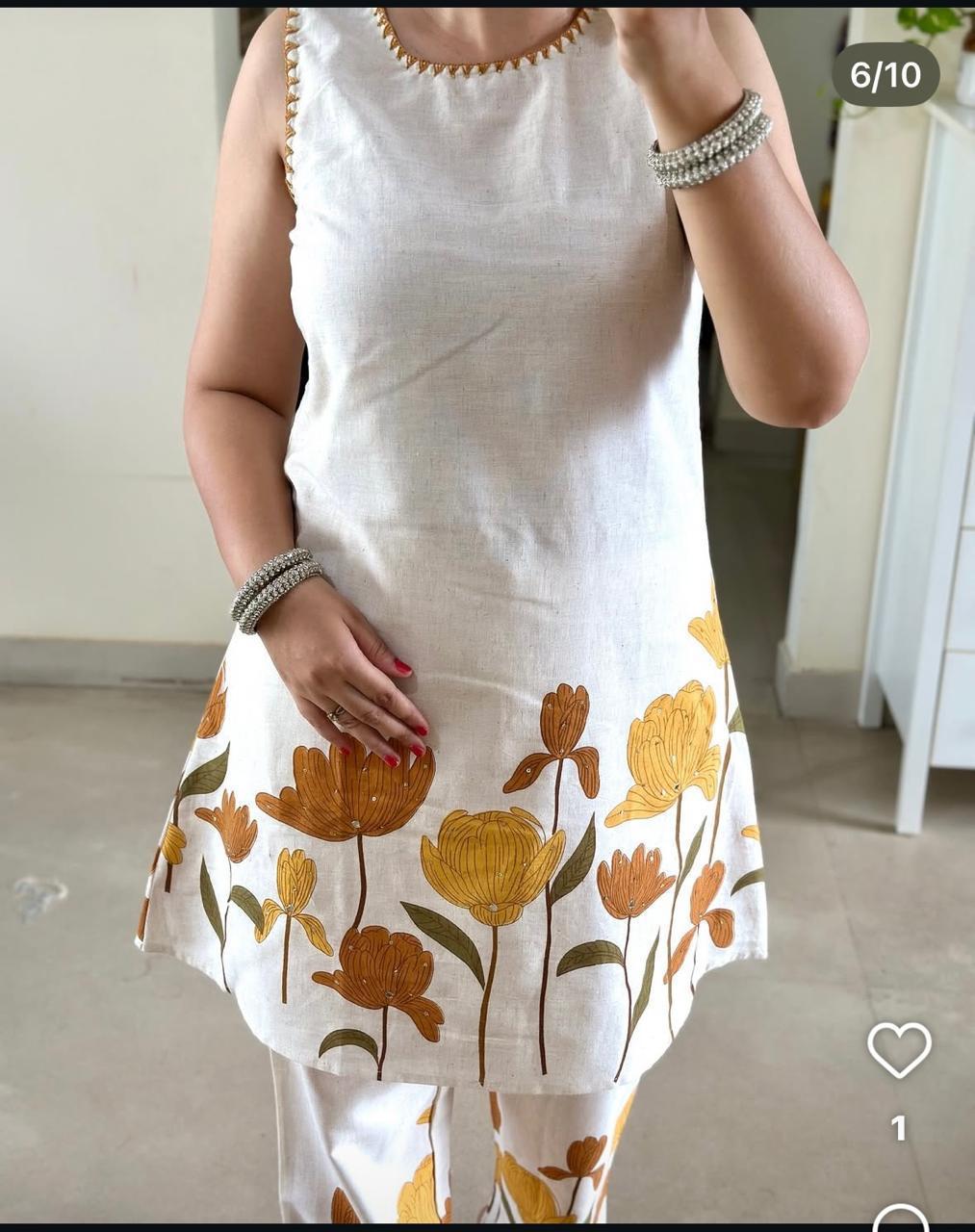 This women's kurta paint set features pure cotton fabric with a vibrant yellow base and delicate floral prints, ensuring breathability and comfort. Ideal for everyday wear, it combines traditional charm with modern style, offering a lightweight and soft feel perfect for warm weather. The set includes a matching kurta and paint, making it a convenient and stylish choice for casual or semi-formal occasions.