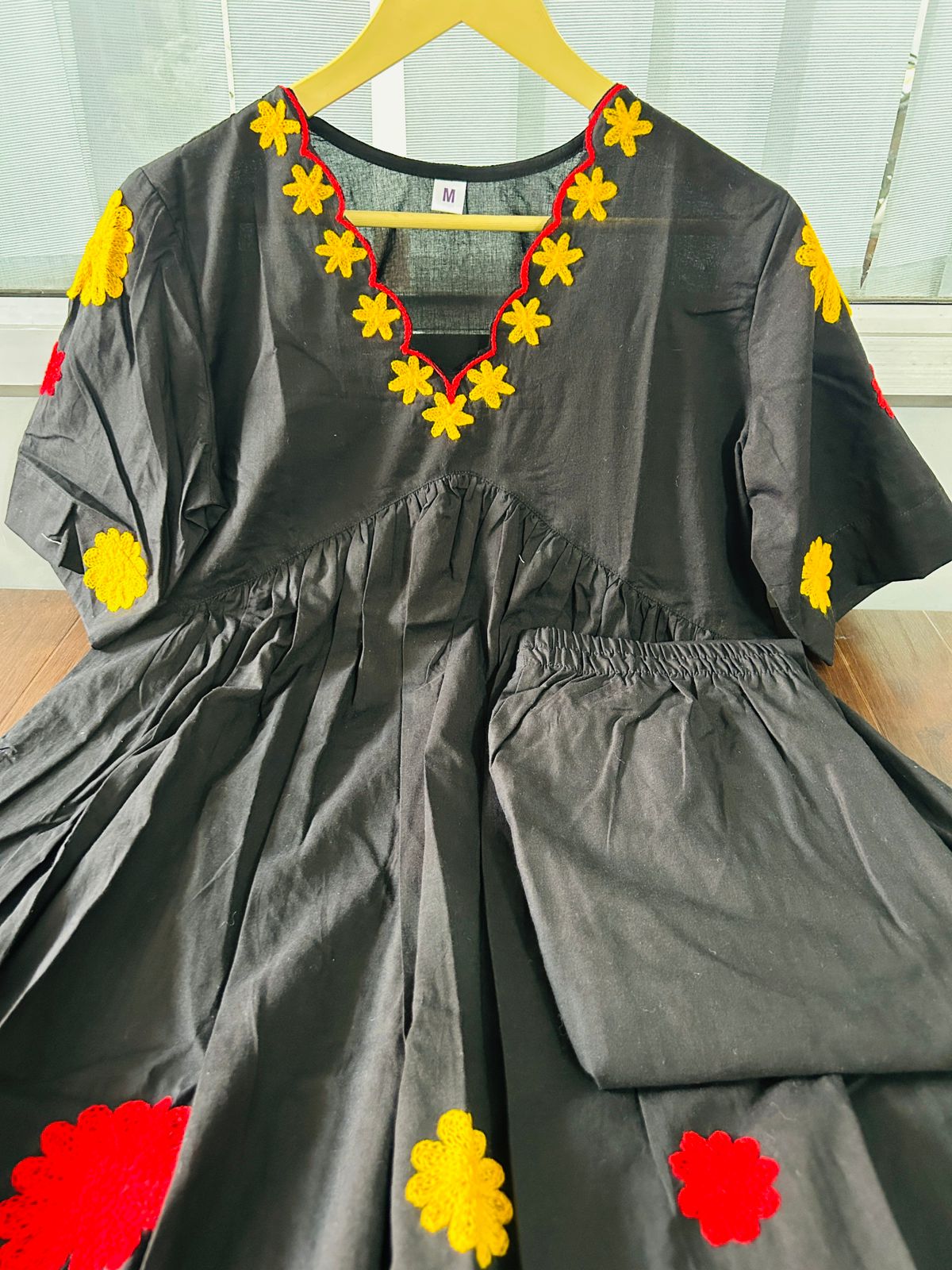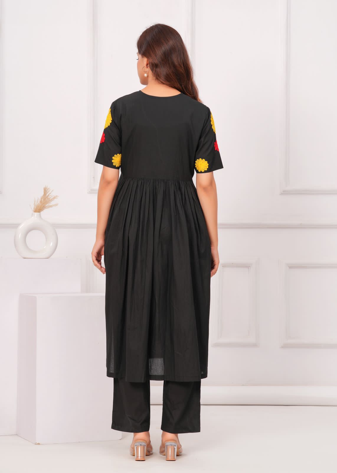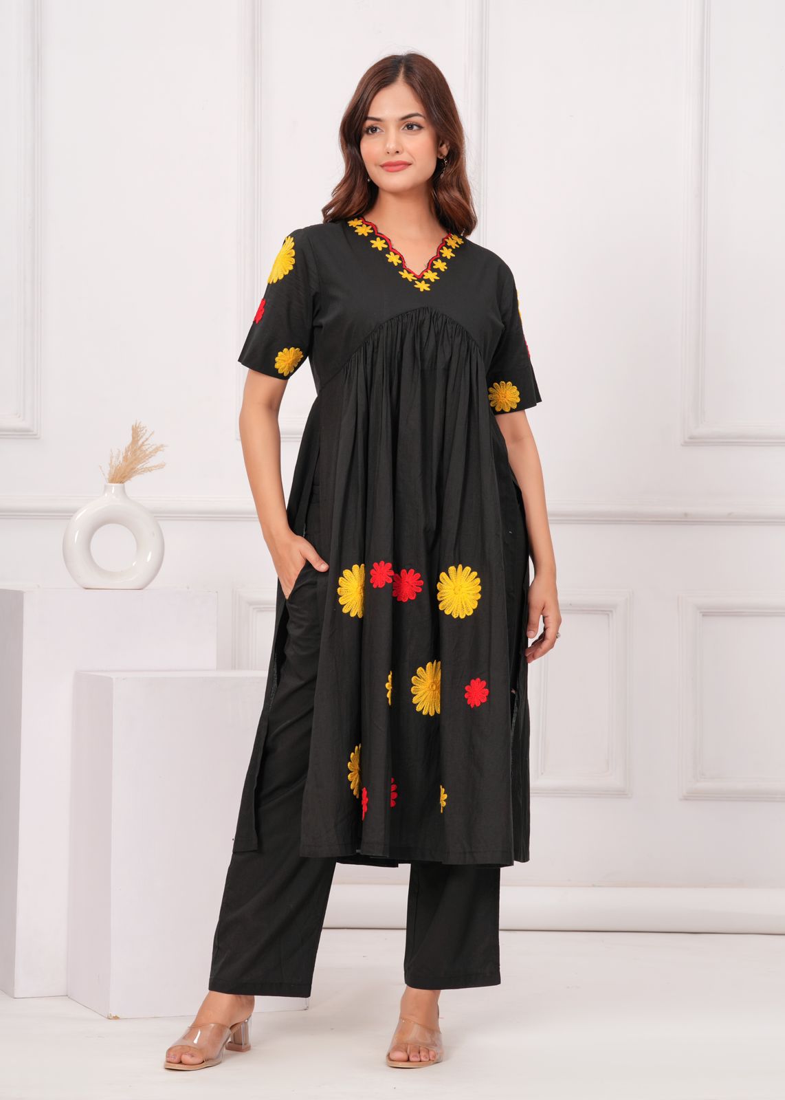 Elevate your ethnic wardrobe with this expertly crafted women's black kurta and palazzo set. Featuring intricate floral embroidery, the V-neck kurta offers a refined silhouette paired perfectly with comfortable palazzo pants. This ensemble blends traditional artistry with modern comfort, ideal for festive occasions or elegant casual wear.