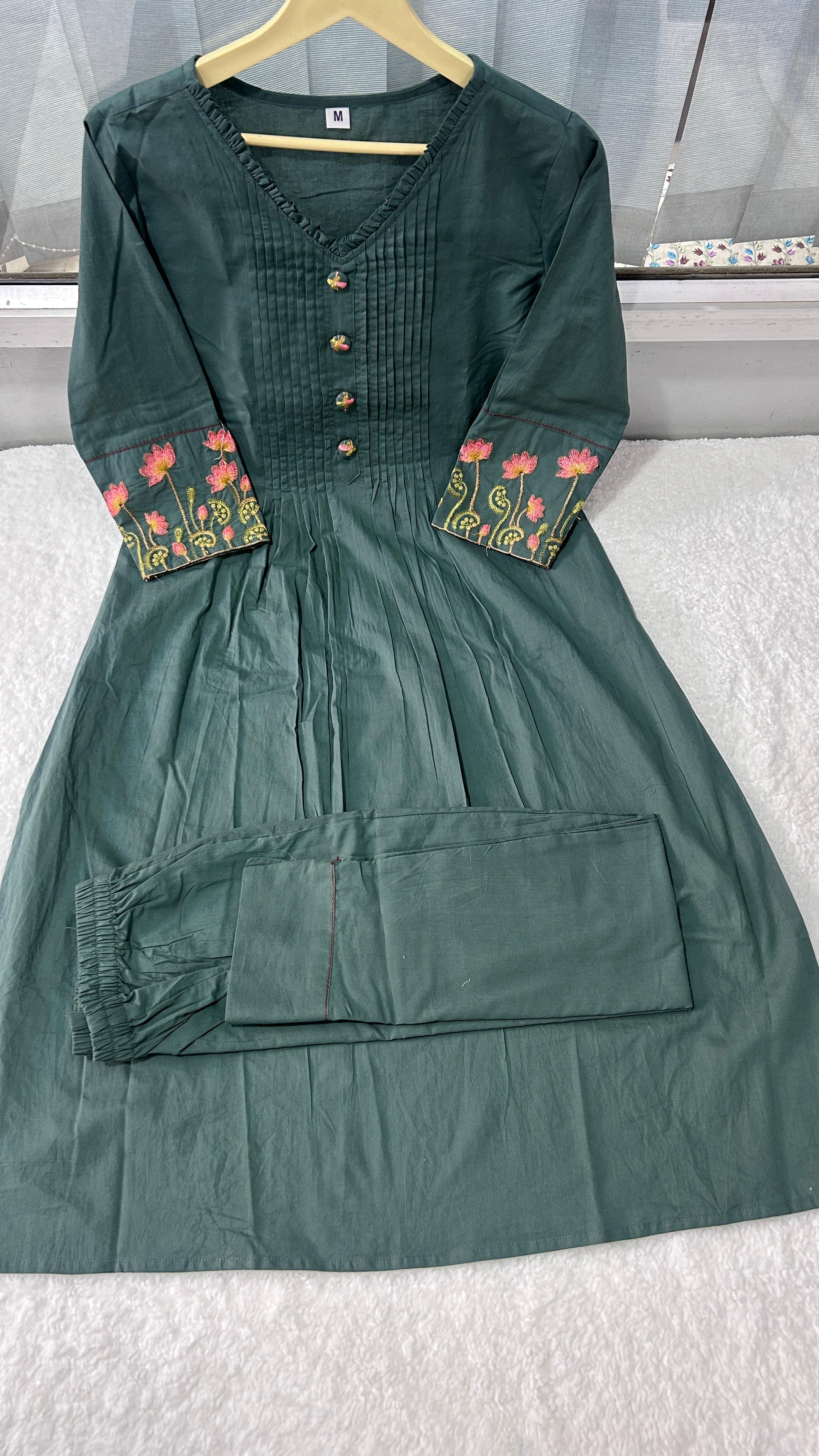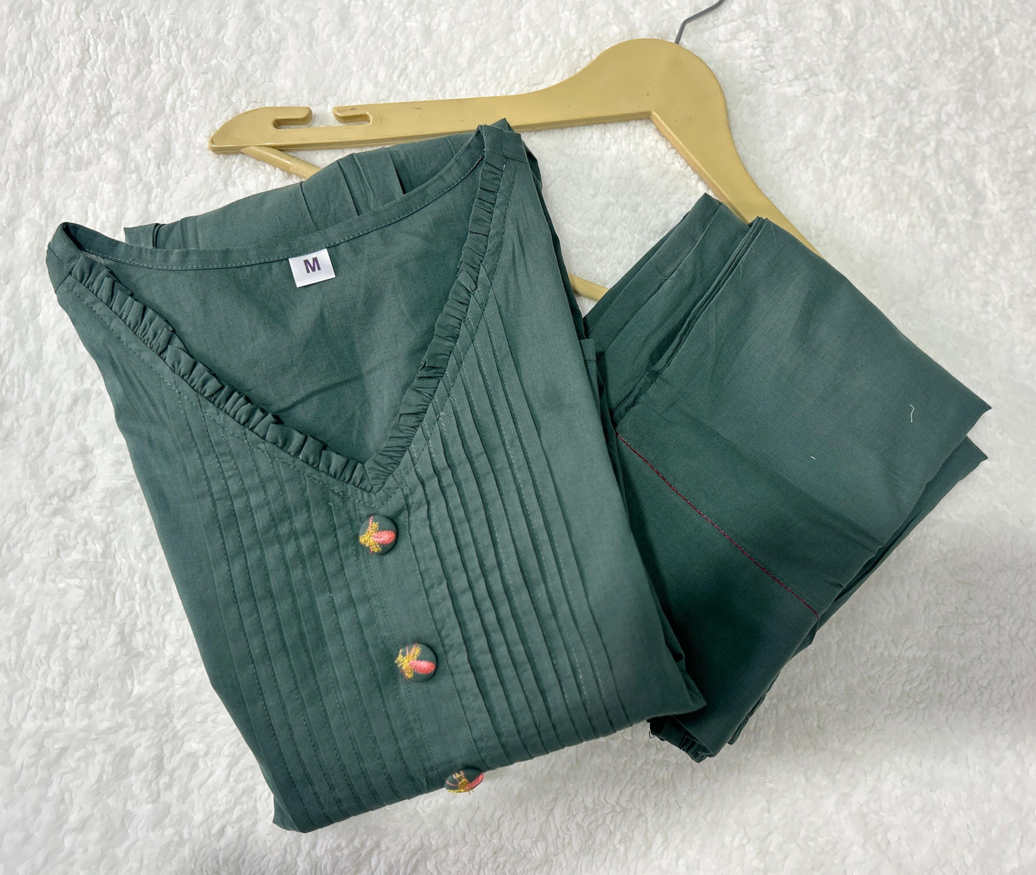 This Women's Cotton A-Line Flared Straight Kurti paired with matching pants offers a blend of comfort and style. Crafted from breathable cotton, it ensures all-day comfort while the A-line flared silhouette provides a flattering fit. The straight cut adds a modern touch, making it suitable for both casual and semi-formal occasions. Paired with coordinated pants, this set delivers a cohesive and elegant look with ease. Ideal for those seeking effortless sophistication in their everyday wardrobe.
