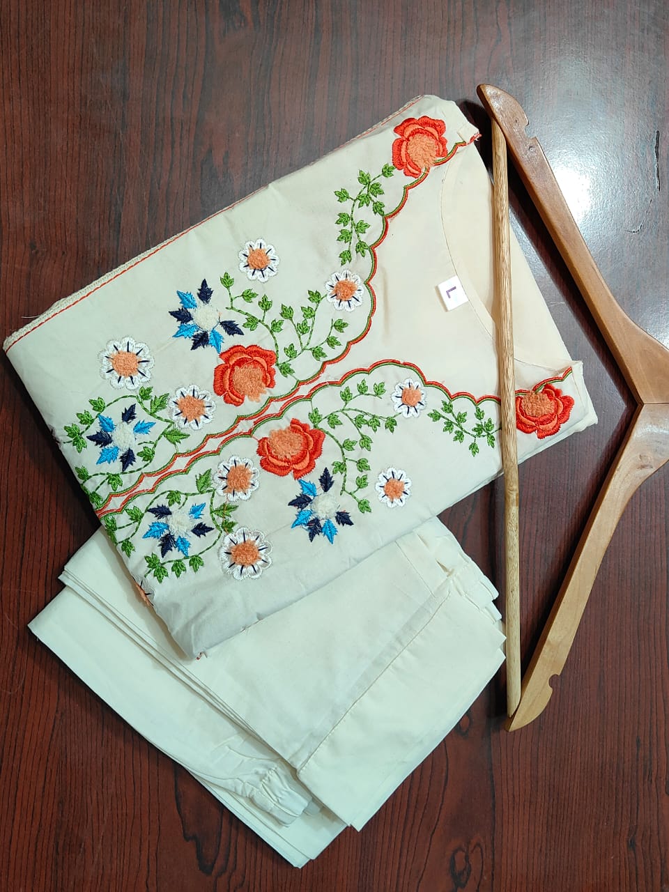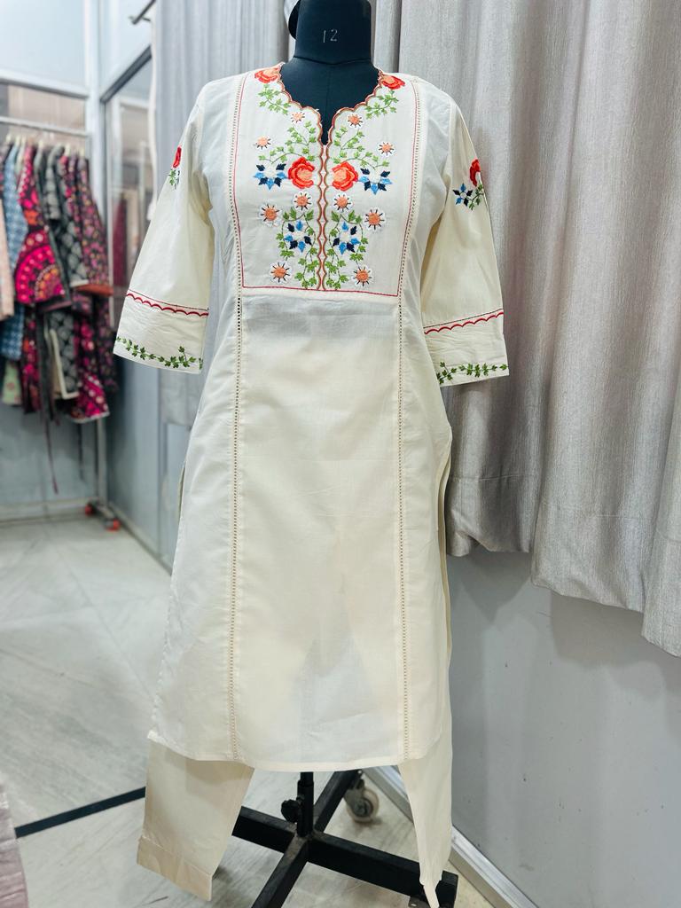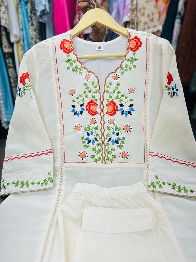 This women's white embroidered cotton kurta and pant set combines traditional craftsmanship with breathable comfort. The finely embroidered kurta offers an elegant, timeless look, while the soft cotton fabric ensures all-day ease and breathability. Paired with matching pants, this set is ideal for both casual and semi-formal occasions, providing a refined silhouette without compromising on comfort. Perfect for those who appreciate subtle detailing and quality natural fabrics.